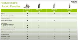 There are four tiers of technology with the Phonak Audeo Paradise. The top of the line premium model being the Audeo P90, then Advanced P70, Midrange P50 and Essential P30.