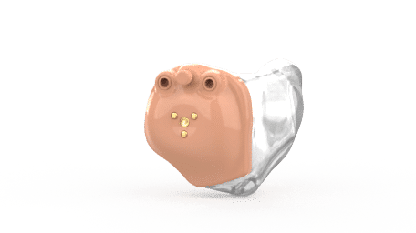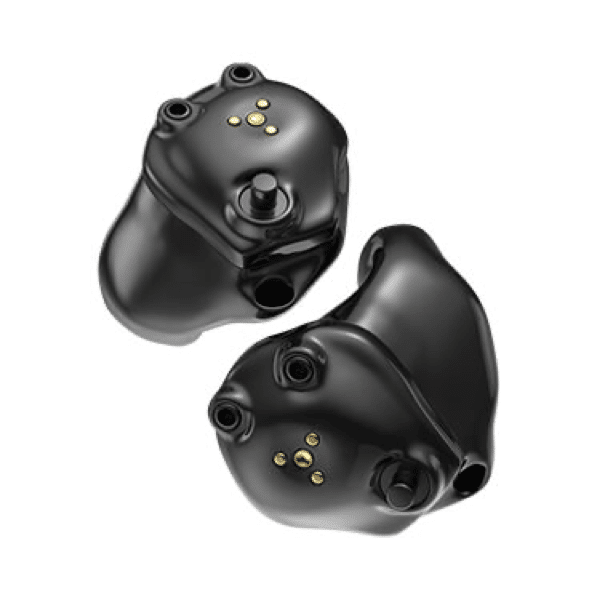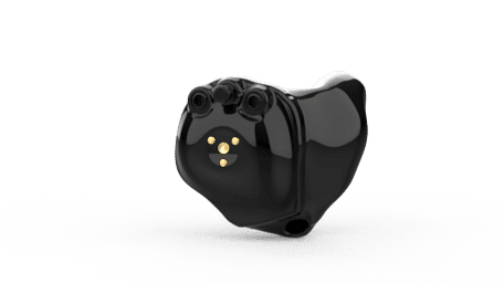 Evolv AI custom rechargeable hearing aids come as an In the Canal (ITC) to Half Shell (HS) style. With a built in lithium ion battery they sustain their charge well past a full waking day of wear even if you are doing hours of audio streaming. Small copper contacts on the faceplate make contact with the charging plate within the charging dock and are easily positioned and held in place by magnets.